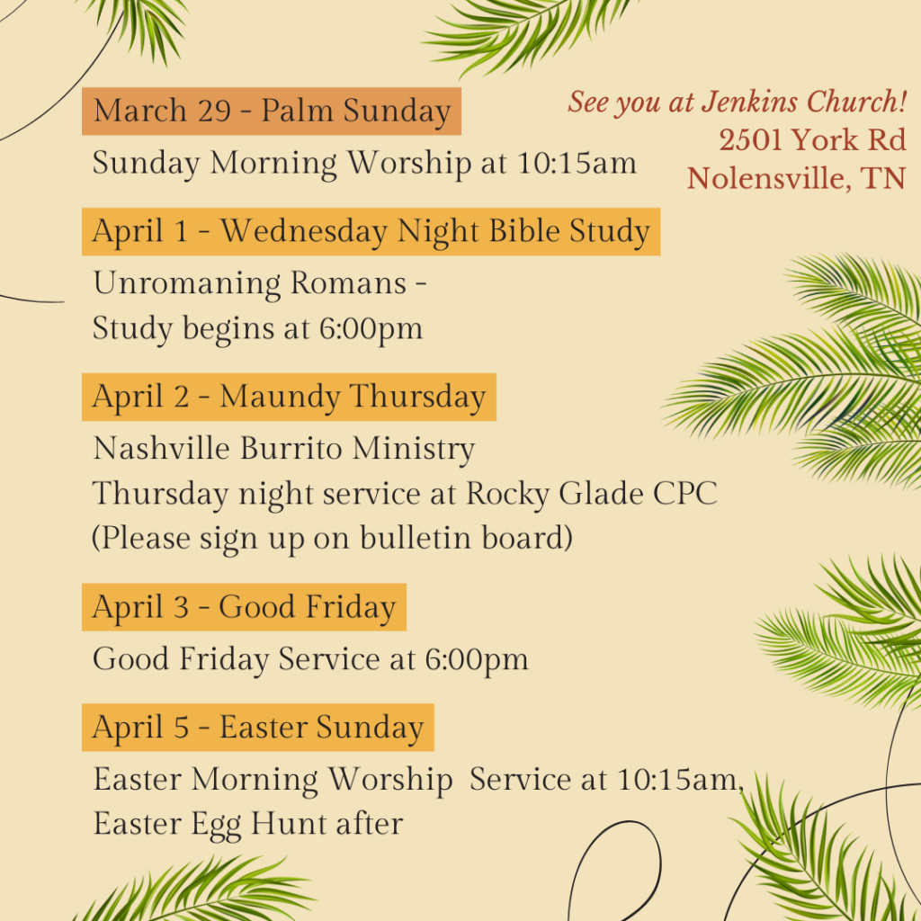 Holy Week & Easter Schedule for Jenkins CP Church. Join us as we celebrate the resurrected Savior!
